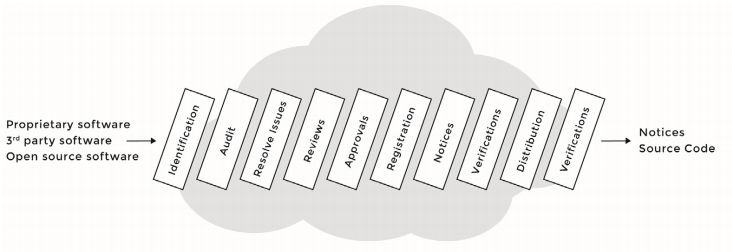 The image below is a sample open source compliance process that companies can commonly use.