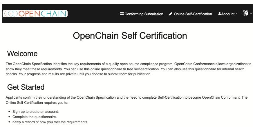 OpenChain Project는 기업이 OpenChain Specification을 충족하는지 자체적으로 확인할 수 있도록 온라인 자체 인증 웹사이트를 제공한다.