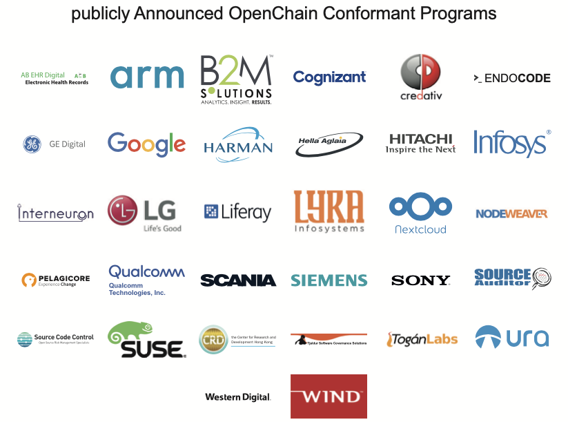 OpenChain 준수 기업에게는 OpenChain 로고를 사용할 수 있는 자격이 주어진다. 이렇게 OpenChain 준수 프로그램을 갖췄다고 인정받은 기업은 소프트웨어 공급망 내에서 오픈소스 컴플라이언스를 충실하게 수행하고 있음을 보여줄 수 있다.