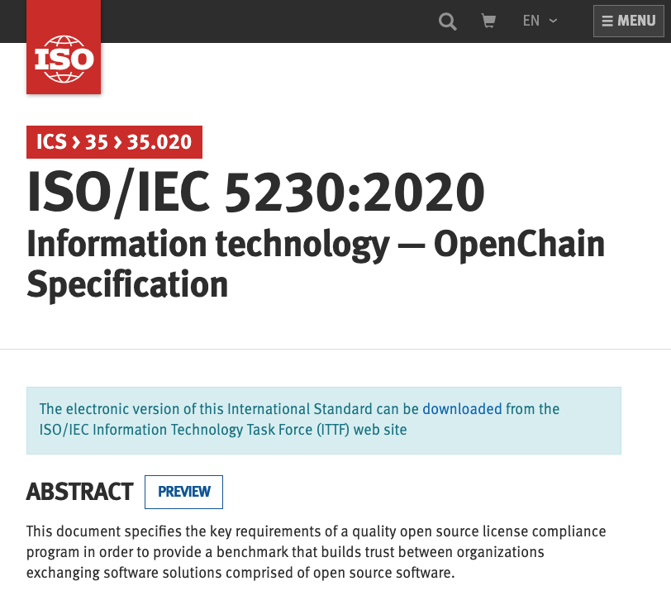 This OpenChain Specification was formally registered as ISO/IEC 5230:2020, the international standard for open source compliance, in December 2020.