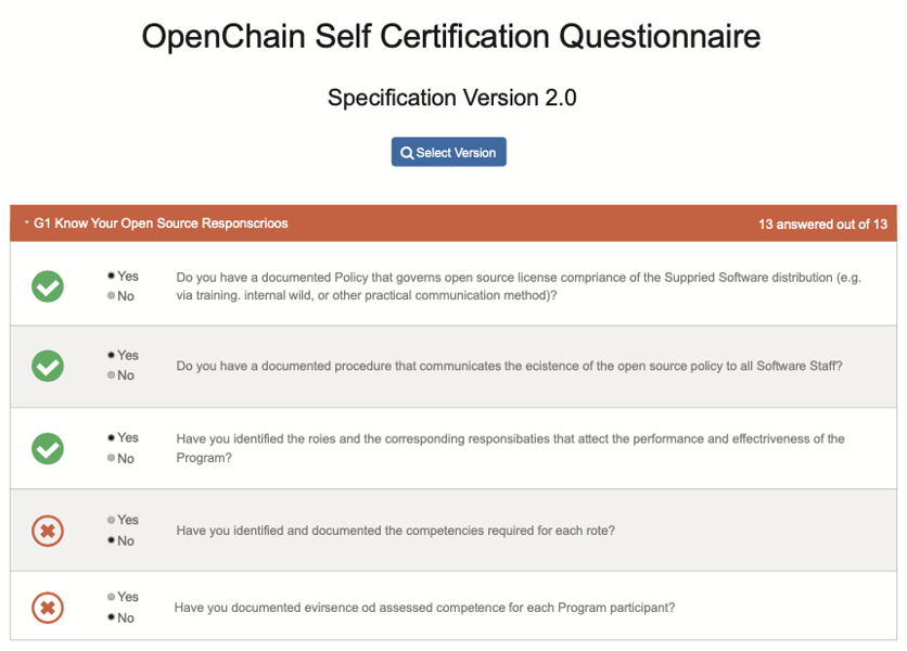 자체 인증은 OpenChain 프로젝트에서 제일 권장하는 방법이며, 비용이 발생하지 않는다는 장점이 있다. OpenChain Project는 기업이 OpenChain 규격을 준수하는지 자체적으로 확인할 수 있도록 OpenChain 자체 인증 웹사이트를 제공한다2. 기업의 오픈소스 담당자는 OpenChain 자체 인증 웹사이트에 가입해 온라인 자체 인증을 시작할 수 있다. 자체 인증은 아래와 같이 Yes/No 질문에 답변하는 방식으로 진행된다.