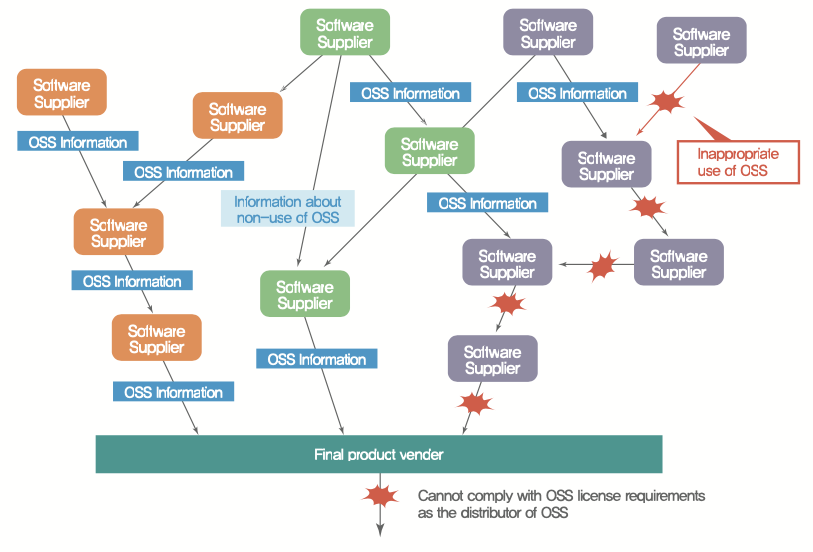 이러한 복잡한 소프트웨어 공급망의 여러 조직 중 한 곳이라도 오픈소스 라이선스 의무를 준수하지 않거나 올바른 오픈소스 사용 정보를 제공하지 않으면 최종 소프트웨어를 배포하는 기업은 오픈소스 라이선스 의무 준수에 실패할 수밖에 없다. 이로 인해 소송을 제기당해 제품 판매가 중단되는 상황이 발생할 수도 있다.