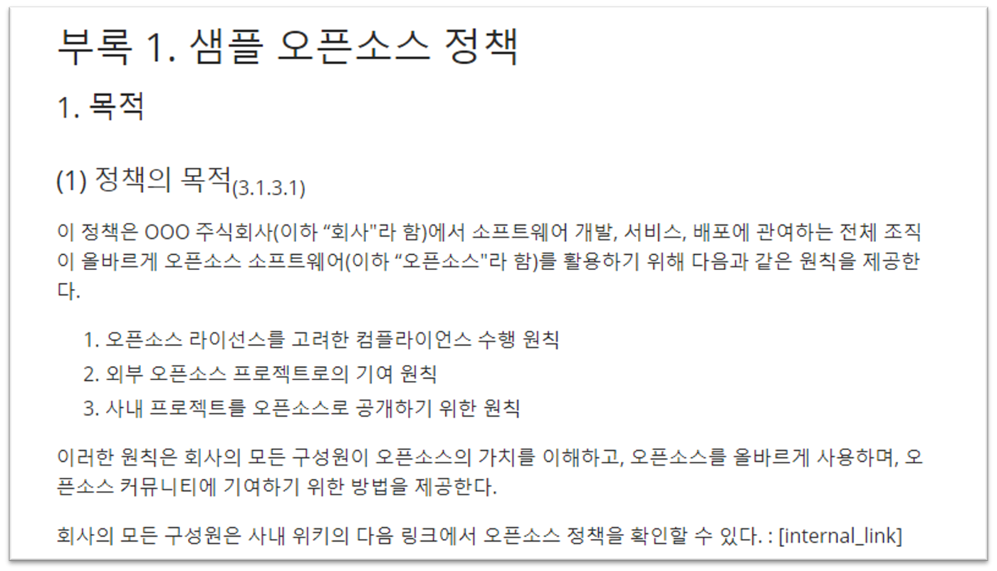이러한 내용은 아래의 예시와 같이 오픈소스 정책에 반영할 수 있다.