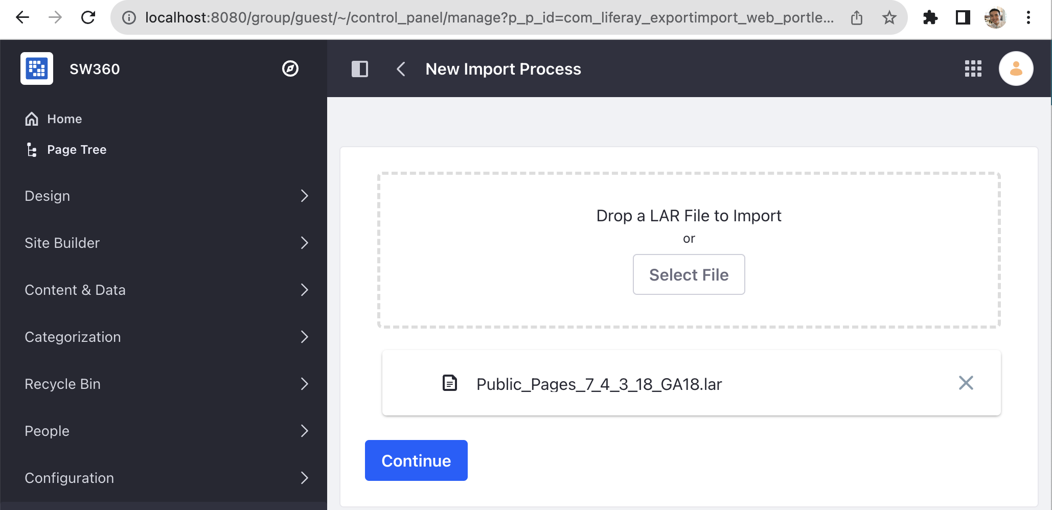 먼저, Public_Pages_7_4_3_18_GA18.lar 파일을 업로드하고 Continue 버튼을 누른다.