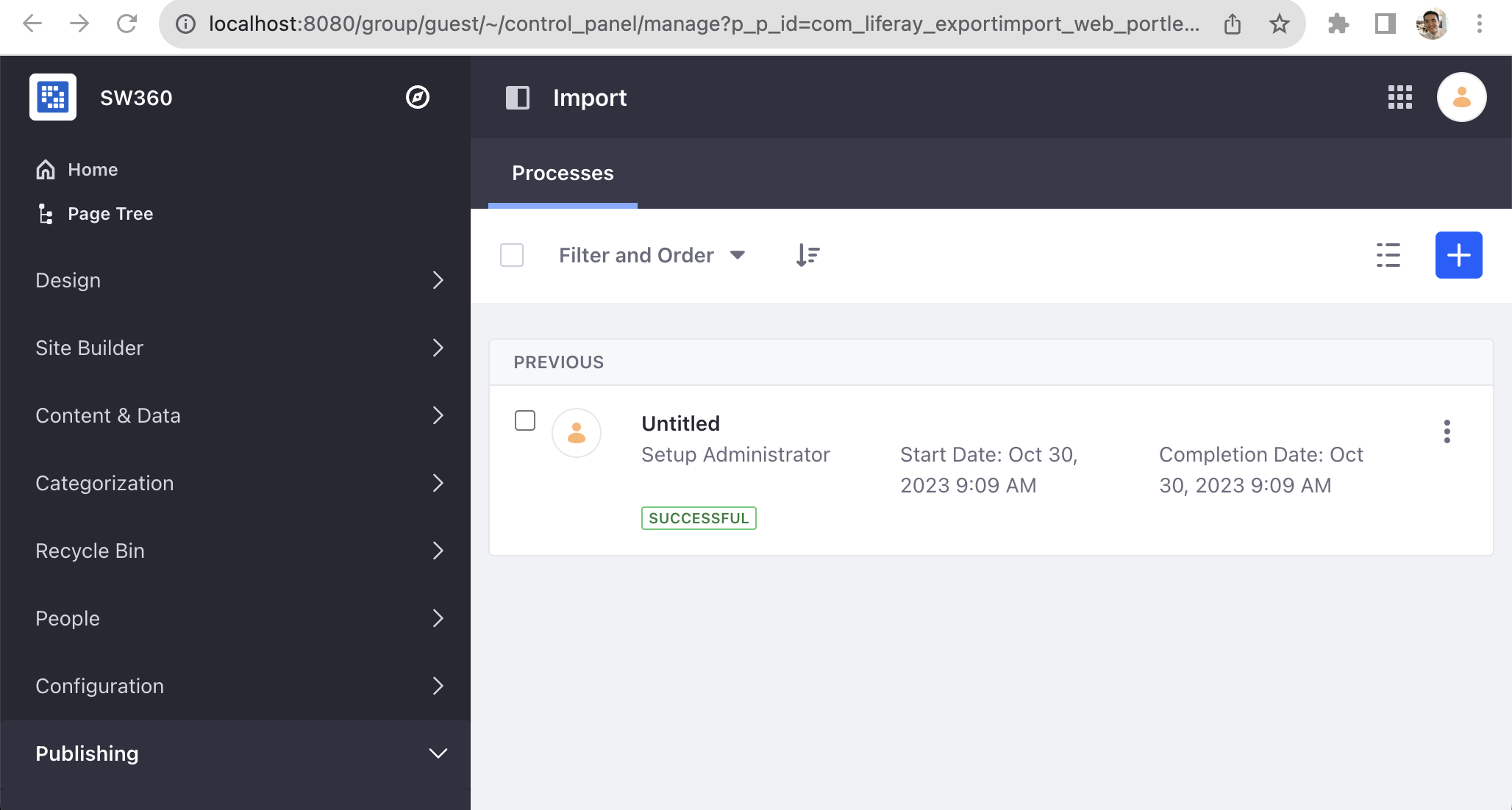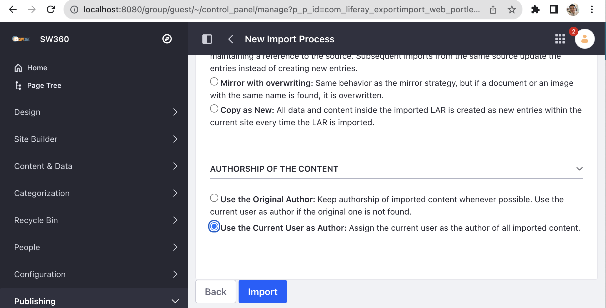 제일 아래의 AUTHORSHIP OF THE CONTENT를 Use the Current User as Author로 변경하고 Import 버튼을 누른다.