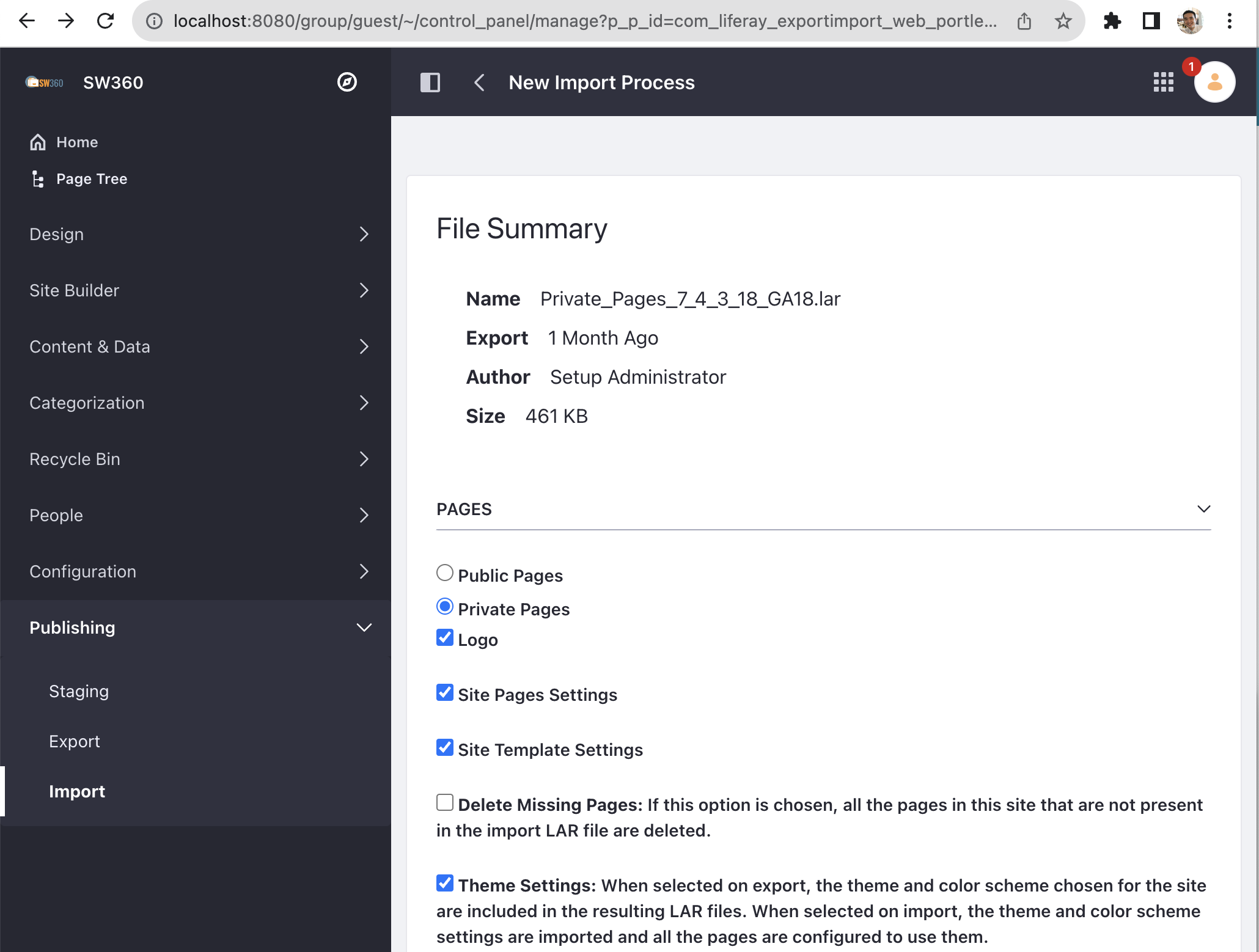 이와 유사하게 Private_Pages_7_4_3_18_GA18.lar 파일을 Import한다. File Summary 화면에서 아래와 같이 PAGES > Private Pages로 변경한다.