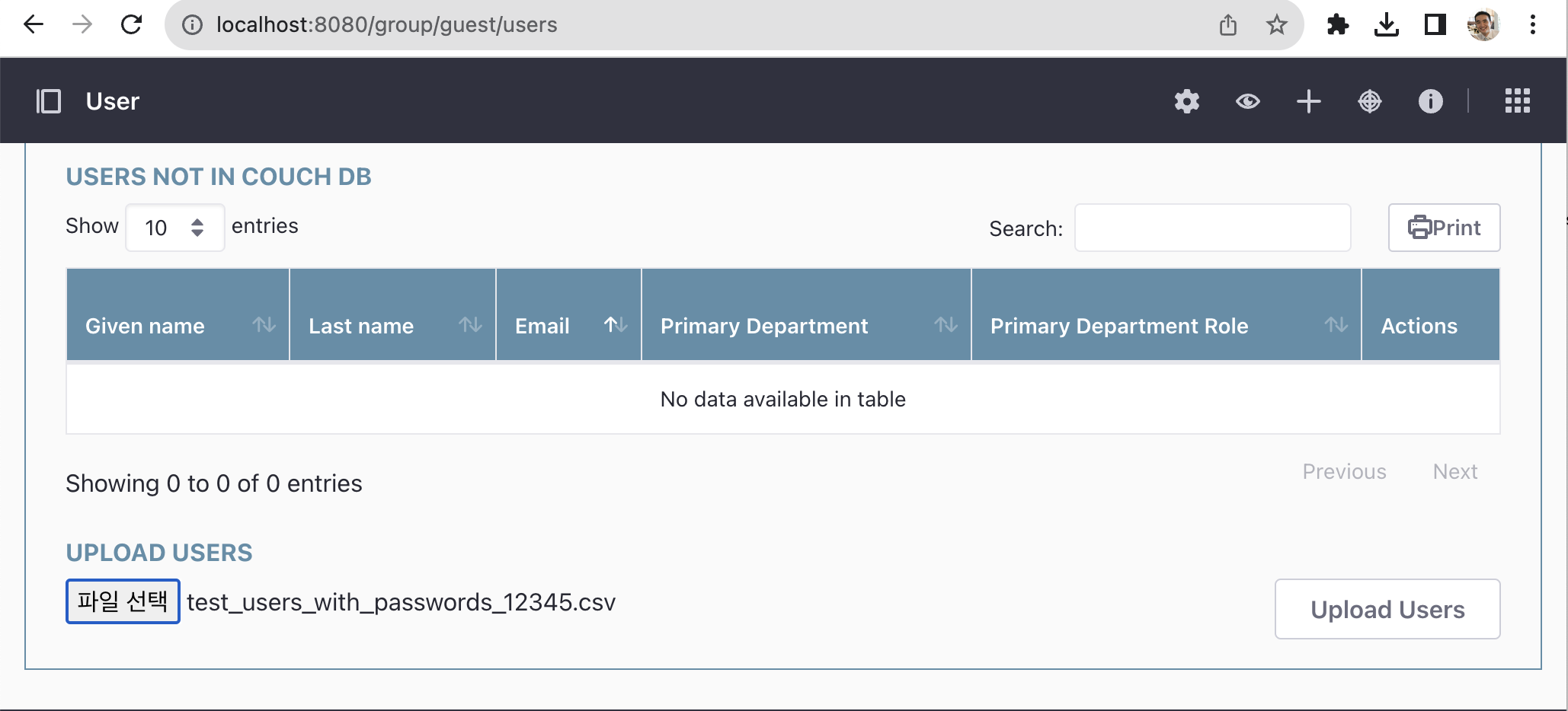 화면 하단의 UPLOAD USERS 메뉴에서 테스트를 위한 User 리스트를 업로드 한다. (테스트를 위한 User 리스트는 여기에서 다운 받을 수 있다. : test_users_with_passwords_12345.csv )