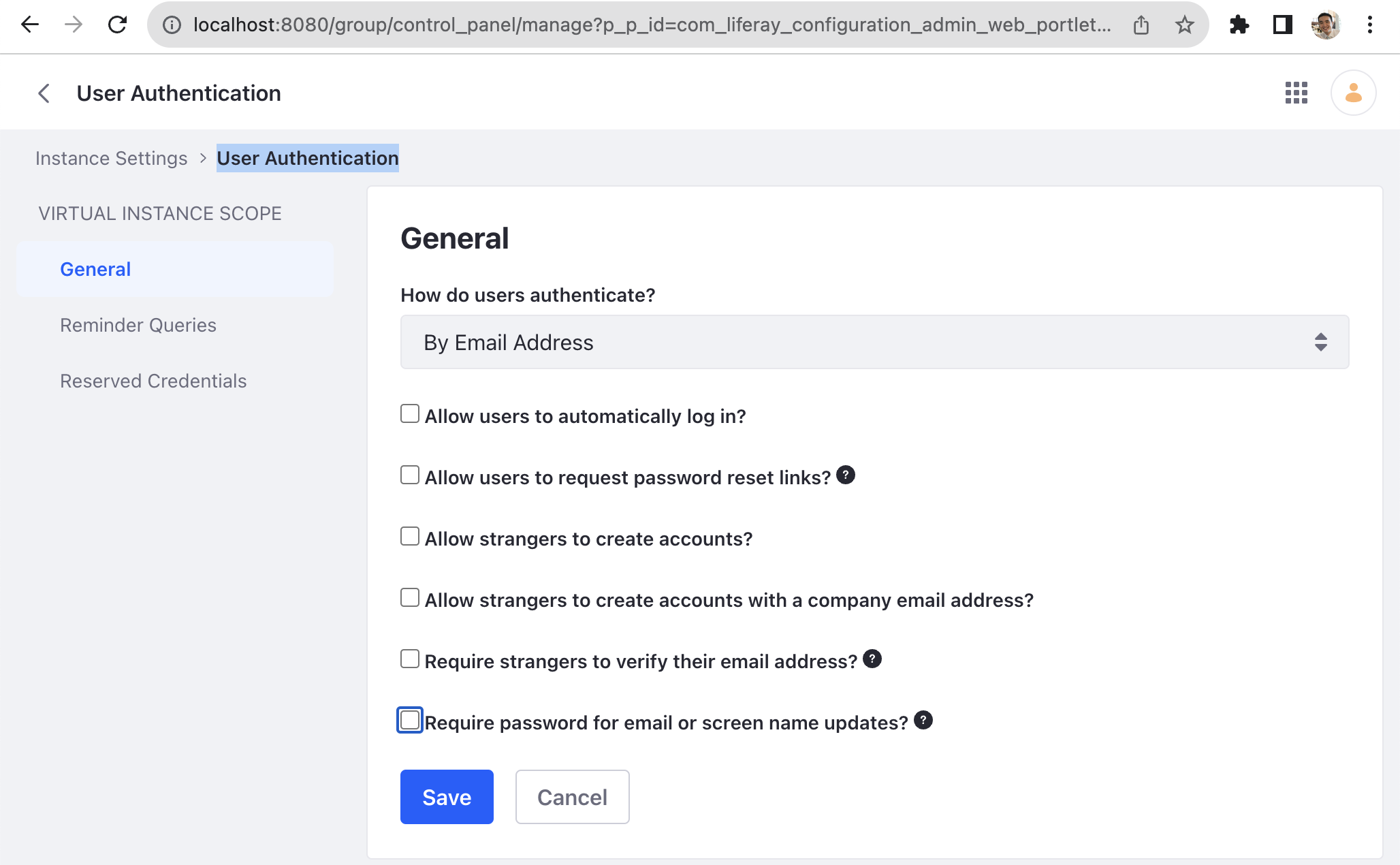이번에는 Instance Settings > PLATFORM에서 User Authentication를 선택한다. General로 진입하여 모든 항목을 Uncheck한다. (관리 목적상 필요한 항목은 Check하여 활성화할 수 있다.) 그리고 Save한다.