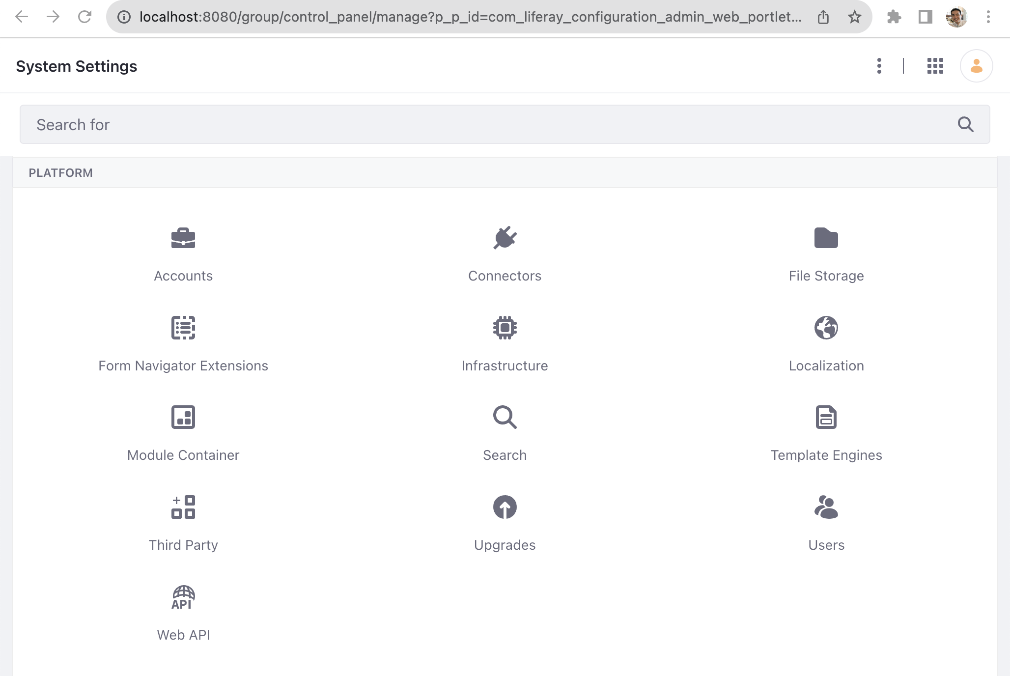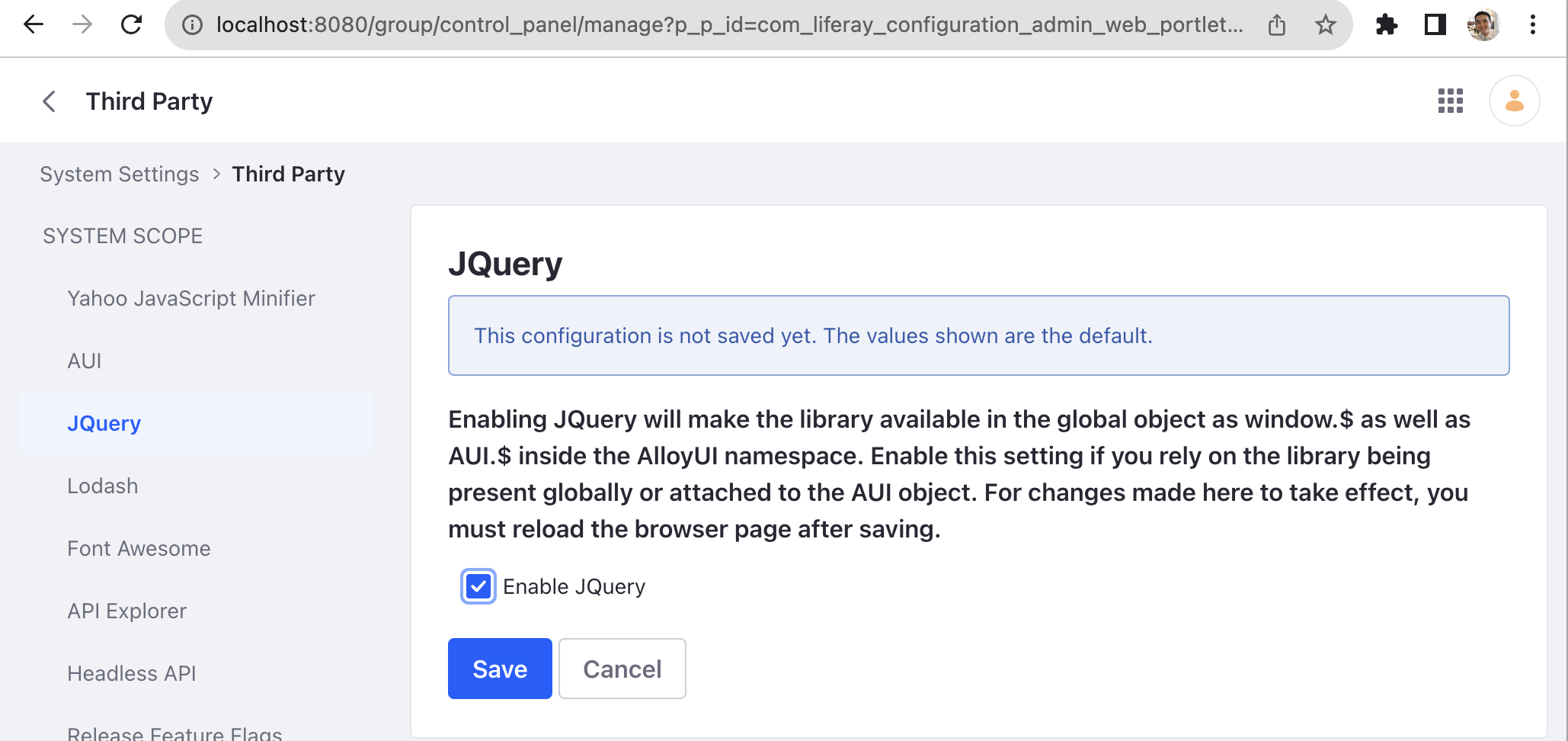 끝으로, jquery와 font awesome을 활성화시켜야 한다. 이를 위해 Control Panel 탭에서 CONFIGURATION > System Settings으로 진입하면 PLATFORM 하위에 Third Party를 볼 수 있다.