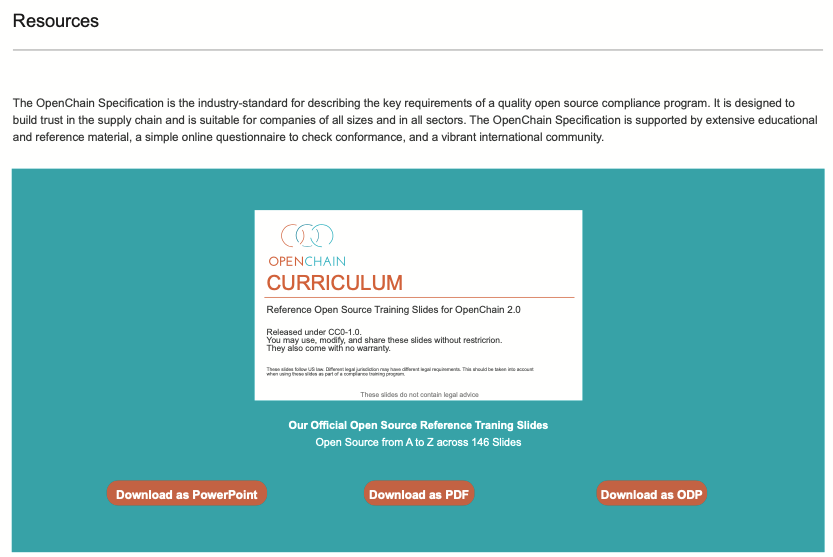 OpenChain 프로젝트에서는 기업이 컴플라이언스 프로그램을 구축하는 데 필요한 정책 문서 템플릿, 교육 자료 등 다양한 리소스를 제공한다. 이 자료들은 OpenChain 표준 준수와 일반적인 오픈소스 컴플라이언스 활동을 지원하기 위해 고안됐으며, 누구나 자유롭게 사용할 수 있도록 CC-0 라이선스로 제공된다.
