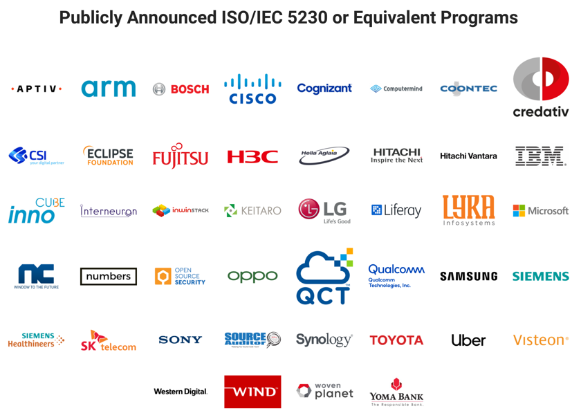 또한, 2021년 7월, 자동차 및 산업 기술 기업인 Boash는 연말까지 모든 그룹사가 ISO/IEC 5230을 준수하는 프로그램을 갖추겠다고 선언하였다. 업계에서는 모든 자동차 제조사나 다른 산업에서도 소프트웨어 공급망 내에서 ISO/IEC 5230을 요구하기 시작하는건 시간 문제라는 전망도 내놓고 있다.