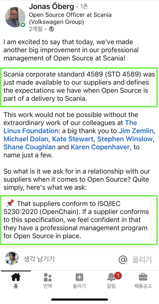 이를 반영하듯 2021년 5월, 폭스바겐 그룹의 Scania는 Supplier가 따라야 하는 자체 기업 표준(STD 4589)에 ISO/IEC 5230 준수를 요구하는 내용을 포함시켰다.