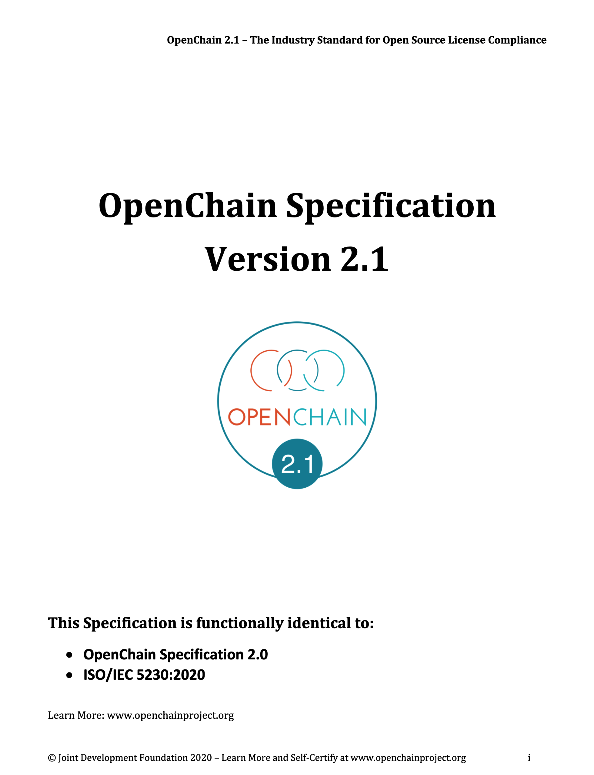 2020년에는 버전 2.1의 규격이 배포됐으며, 기업이 오픈소스 컴플라이언스 달성을 위해 꼭 수행해야 할 여섯 가지 핵심 요구사항과 이를 입증하기 위해 필요한 자료 목록을 정의하고 있다.